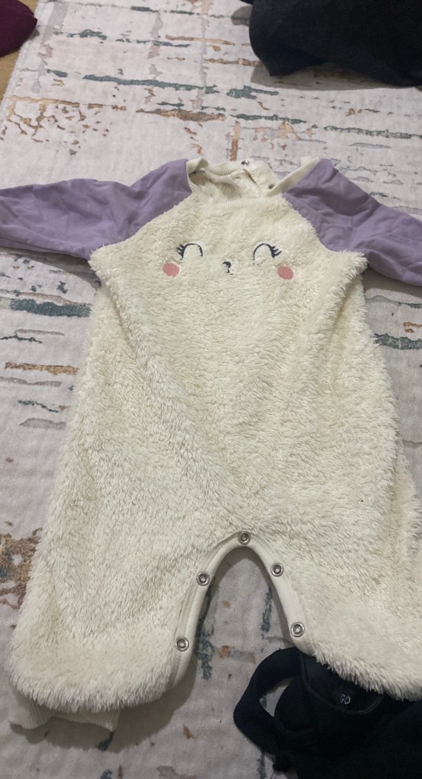 Pastel renklerde peluş detaylı, beyaz ve desensiz, lila kollu bebek kız tulumu. Alt kısmında kolay değişim için çıtçıtlı kapama bulunur.