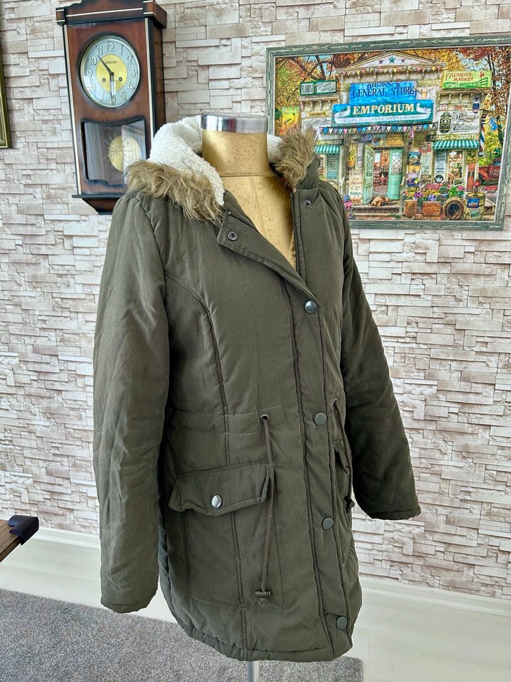 Peluş detaylı kapüşonlu, içi yumuşacık ve sıcacık tutan, hem fermuarlı hem çıtçıtlı, haki kadın mont. Yep yenidir. En fazla 3-4 kez giymişimdir. Yaşadığımız iklim çok soğuk olmadığı için iki yıldır kullanmadığımı farkedince, daha soğuk şehirde yalayan birinin işine yarasın istedim. Keyifle giyilsin inşallah. 38-40 bedenle uyumludur