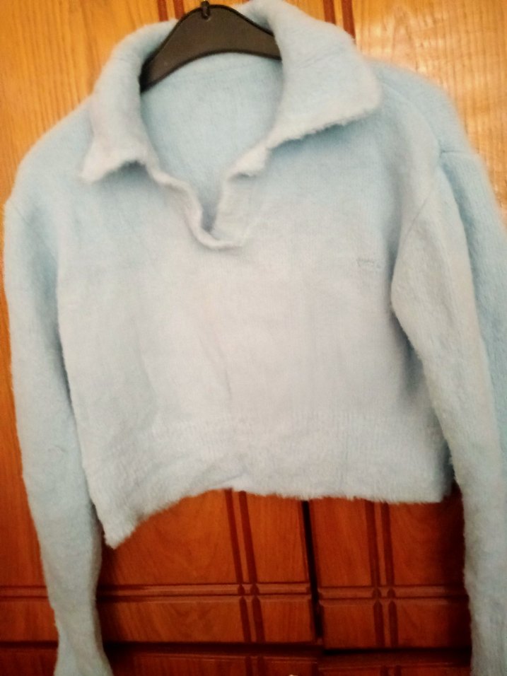 Kadınlar için peluş detaylı, yakalı ve uzun kollu, açık mavi renkte, rahat ve sıcak kumaştan yapılmış, ince kesim sweatshirt.