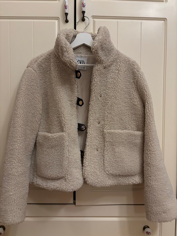 Bej renkli, peluş detaylı kısa ceket, notched lapel yakalı ve uzun kolludur. Rahat kesimi ve iki ön cepli, günlük sokak stili için uygundur.