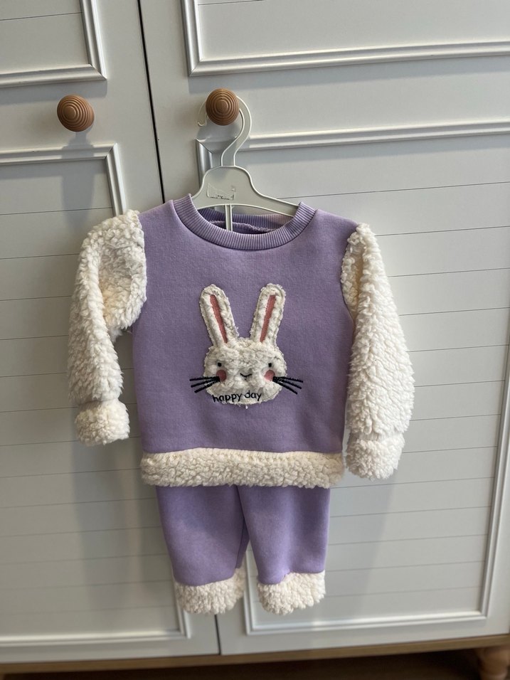 Uzun kollu, peluş detaylı lila renkli bebek kız takımı, önünde nakışlı tavşan figürü bulunur, peluş detaylı pantolonla tamamlanır. Etiket mevcut değil hiç giyilmedi