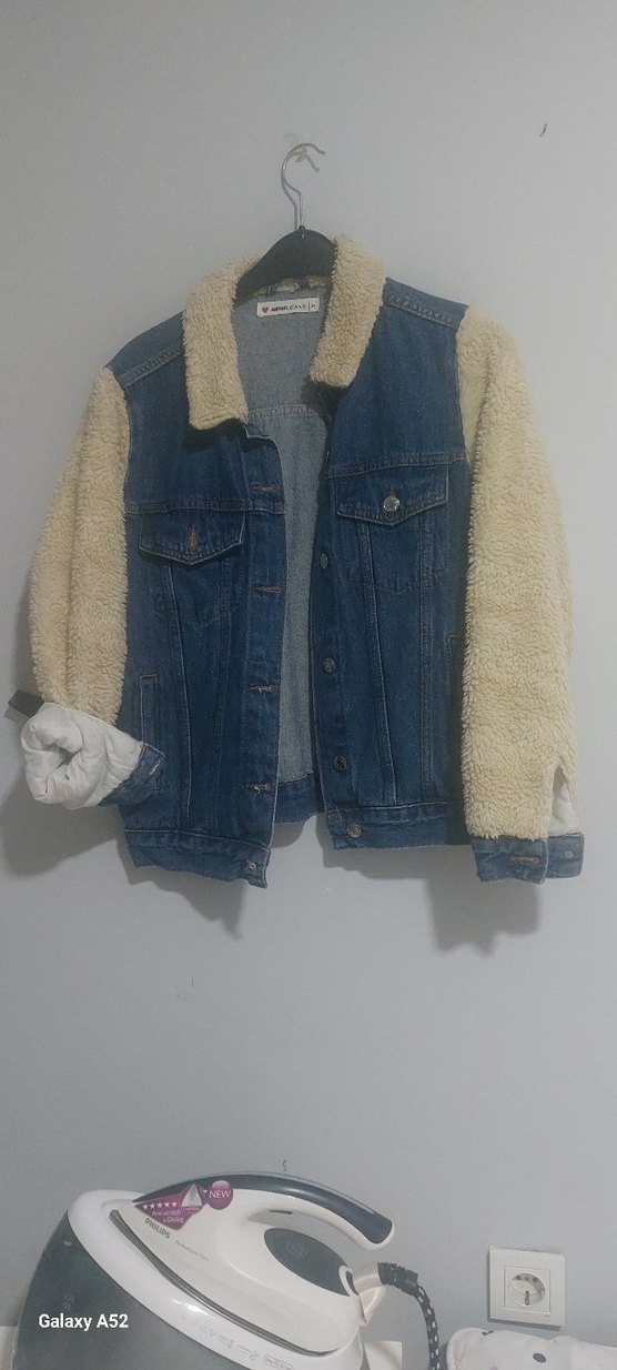 Kadınlar için, peluş detaylı kollara ve yakaya sahip, bol kesim mavi denim ceket. Normal boyda, uzun kollu ve çıtçıtlı, günlük kullanıma uygun sokak stili.