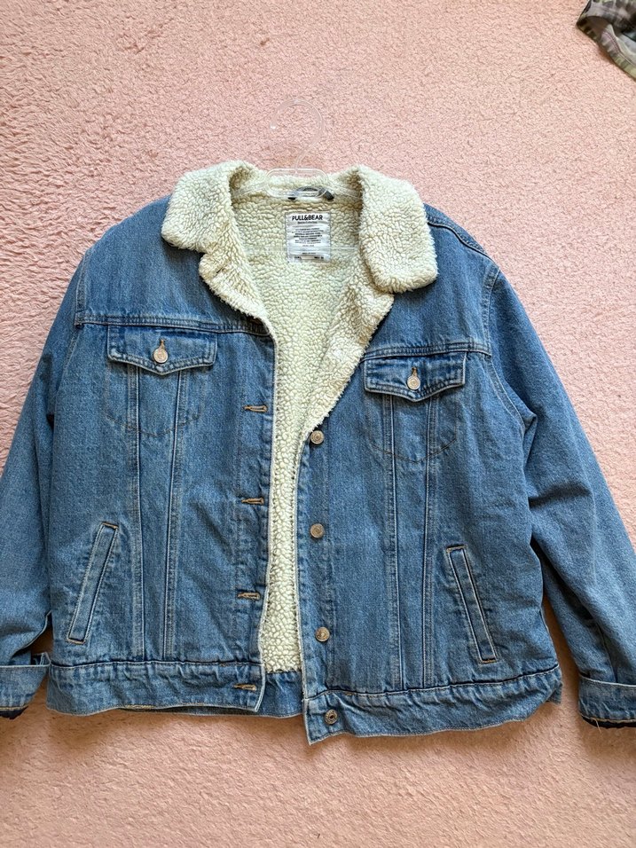 Mavi denim, peluş detaylı, notched lapel yakalı, bol kesim ve uzun kollu kadın ceket. Rahat sokak stili için ideal.