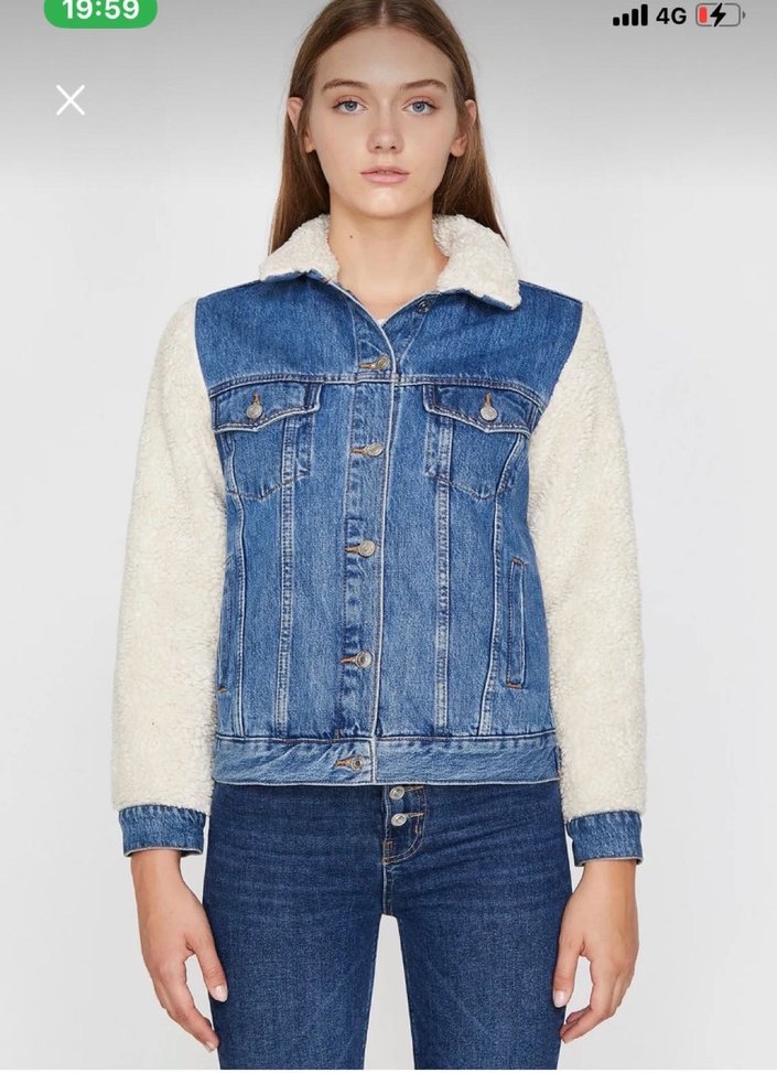 Peluş detaylı uzun kollu, mavi denim kot ceket. Salaş kesim ve normal boyda, günlük ve sokak tarzına uygun.