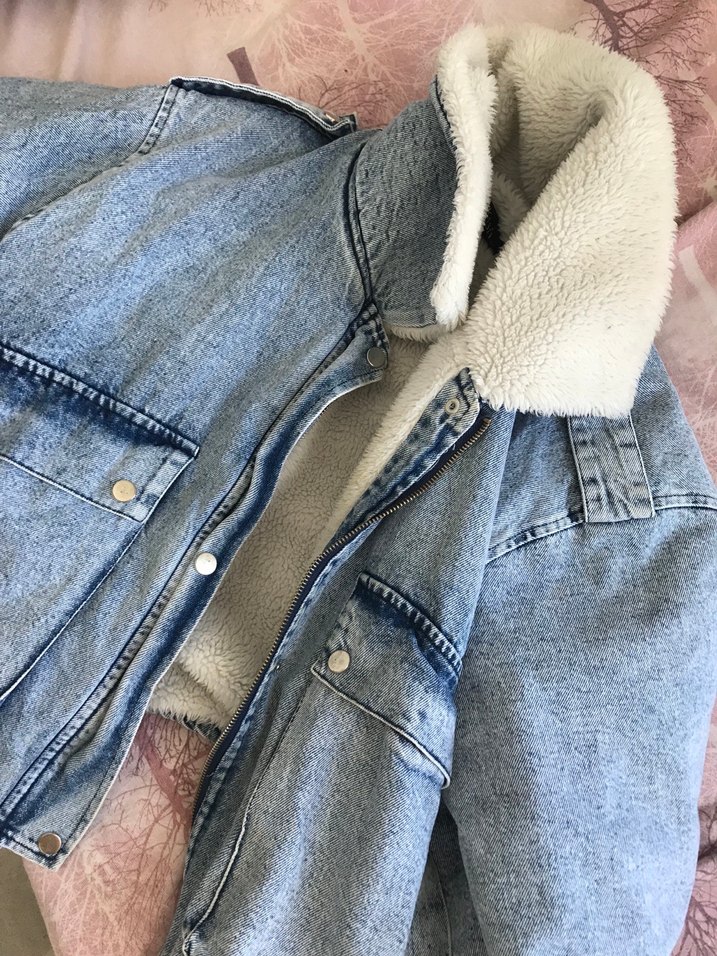 Peluş detaylı mavi rahat kesim kot ceket