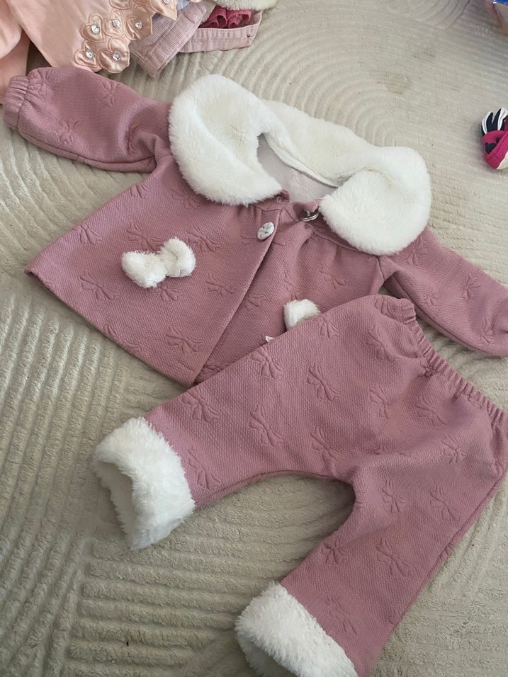 Uzun kollu, peluş detaylı yakalı ve paçalı pembe bebek kız takımı. Kumaşında hafif dokulu desen bulunur, yumuşak ve sıcak tutar.