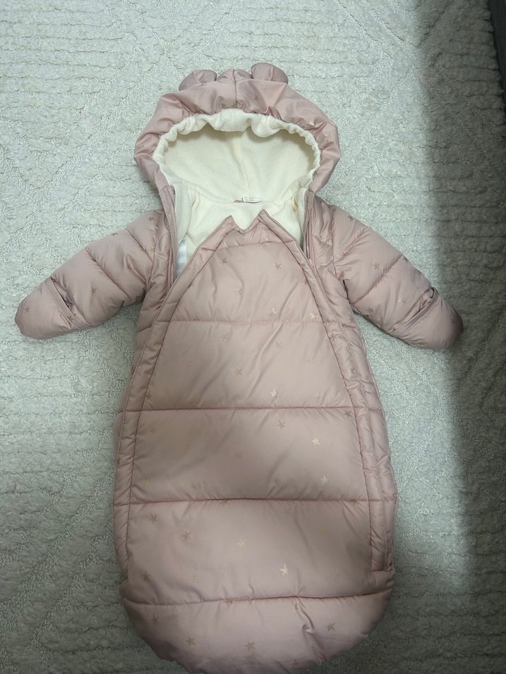 Peluş detaylı kapüşon ve kesimli yaka özellikli, pastel pembe renkte, yumuşak ve sıcak kumaş astarlı bebek tulumu. ❄️ Hm 0-2 ay bebek kundak tulum