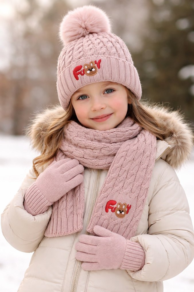 Peluş ponponlu, nakış detaylı pembe çocuk bere, atkı ve eldiven seti. Yumuşak ve sıcak kumaş, soğuk havalarda korur.