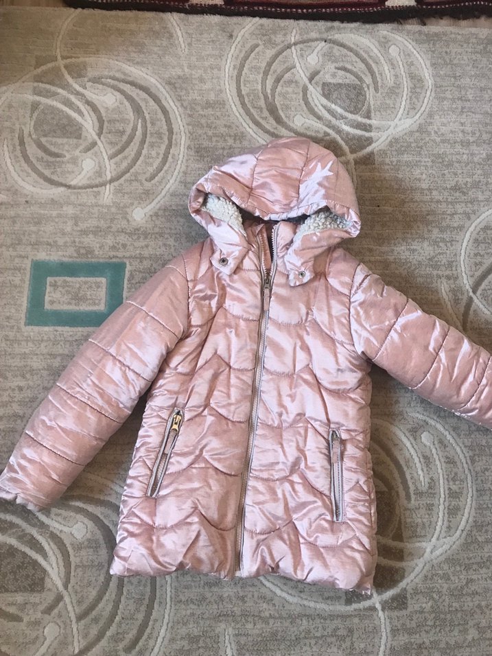 Peluş detaylı, kapüşonlu ve pastel pembe renkte, rahat kesim kız çocuk montu.