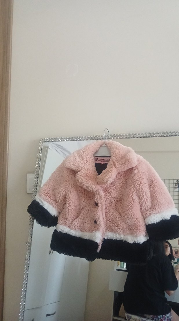 Peluş detaylı, notched lapel yakalı, bol kesim pembe kız çocuk mont. Baskılı desene sahip, rahat ve trend sokak stili için uygun. AMERAKADAN GELDİ sayili giyildi