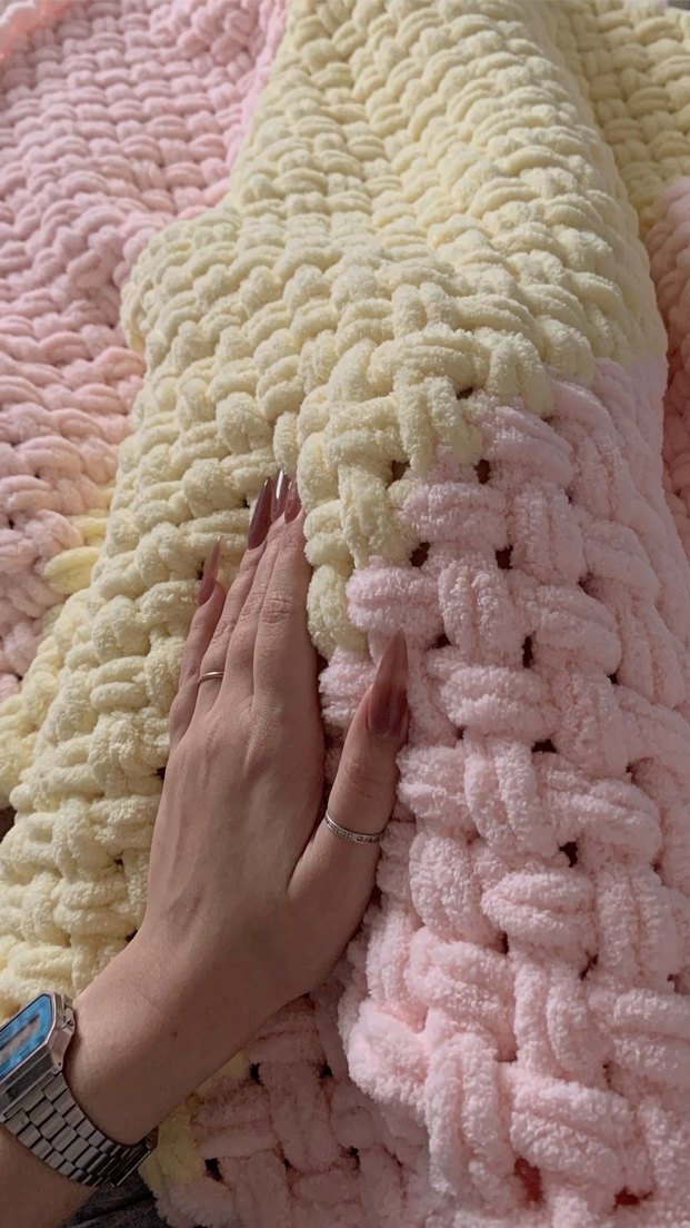 Peluş Detaylı Pembe Sarı örgülü Puffy battaniye