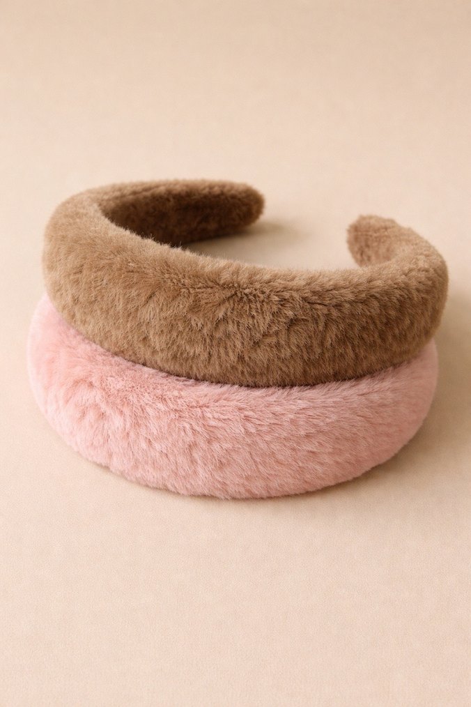 Bej ve pastel pembe renklerde, peluş detaylı yumuşak kumaştan yapılmış, rahat ve bohem stile uygun taçlar seti.