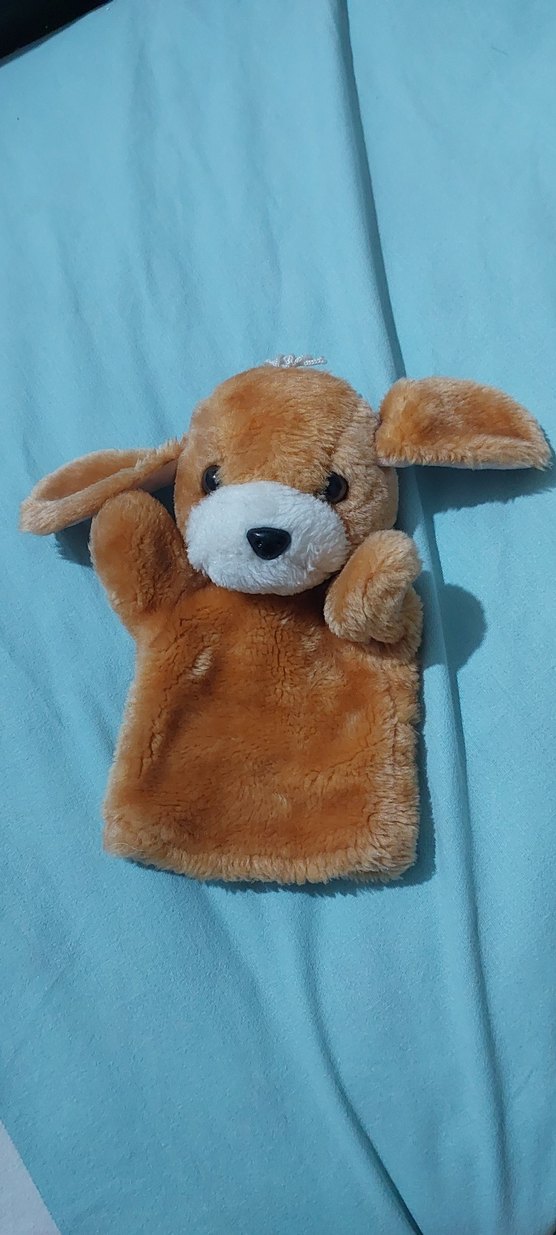 Pastel kahverengi, yumuşak dokulu, kulakları sarkan sevimli köpek şeklinde peluş el kuklası.
