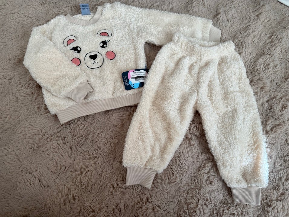 Peluş detaylı, baskılı ayıcık desenli etiketli tulum . 6-12 ay bedene uygundur