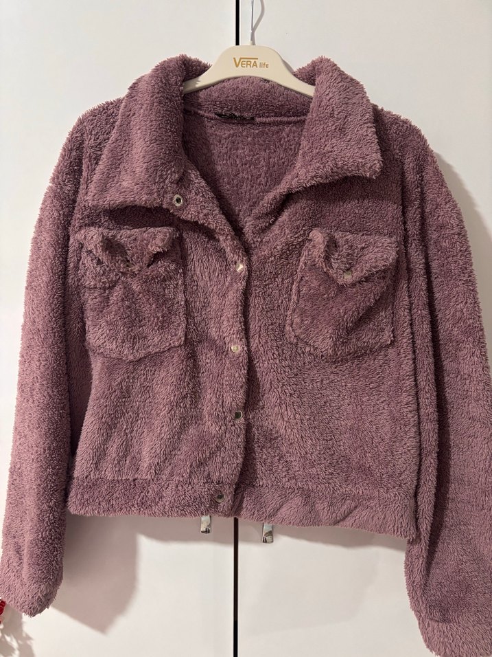 Bu rahat ceket uzun kollu, kesik yaka ve bol kesimdir. Çıt çıt düğmeli ve iki cep detayına sahiptir, yumuşak ve sıcak kumaştan üretilmiştir.