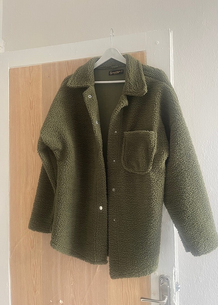 Haki yeşil rengi. Tek kusuru 1 tane çıtçıt yeri koptu. En sonda fotoğrafı var zaten
