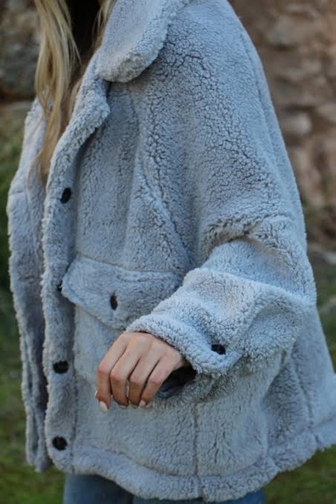 peluş kumaştan, bol kesim ve uzun kollu, kürk detaylı midi boy kadın kaban. Rahat ve günlük sokak stili için uygundur. ❄️