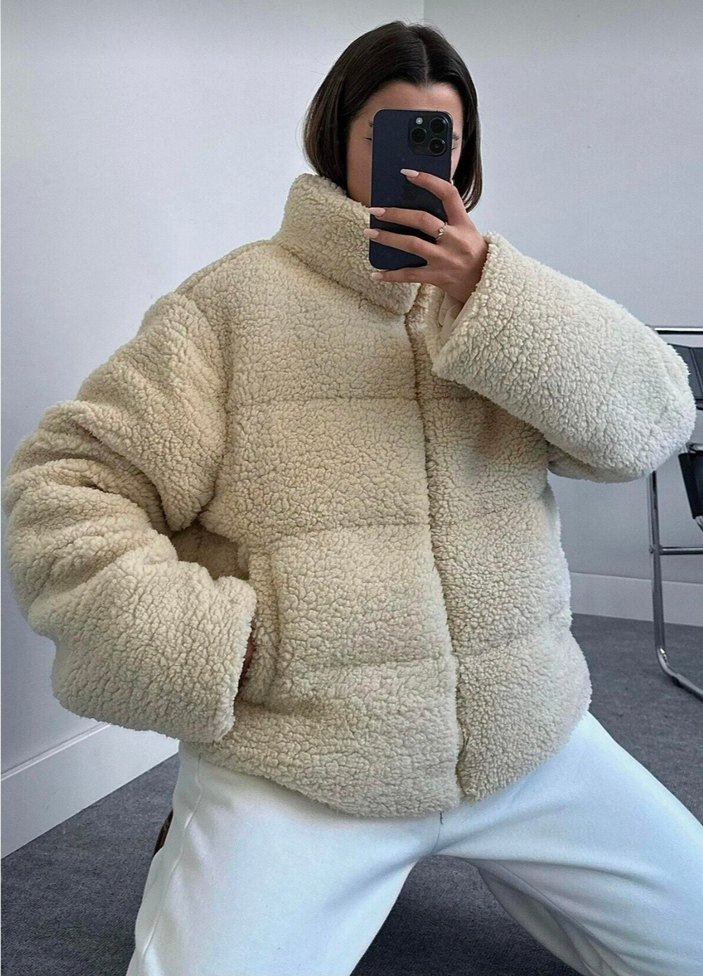 Peluş kumaştan, bol kesim, yüksek yakalı, uzun kollu midi boy kadın kışlık ceket. Günlük rahat sokak stili için uygundur. ❄️