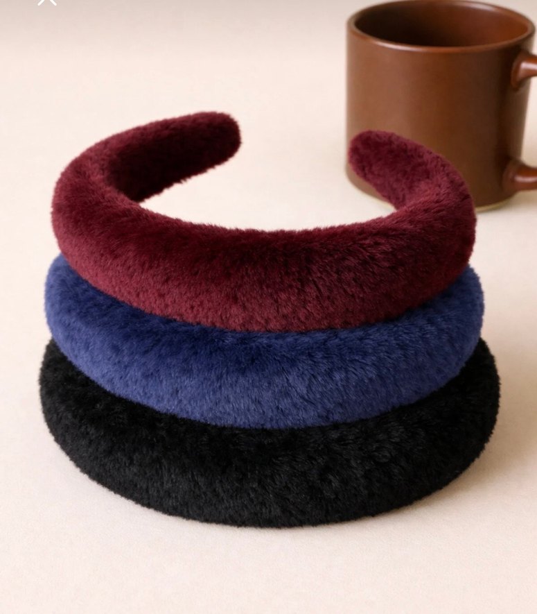 Bordo, lacivert ve siyah renklerde kürklü, yumuşak ve sıcak saç bantları. Bohem ve retro tarzlara uygun rahat aksesuarlar.