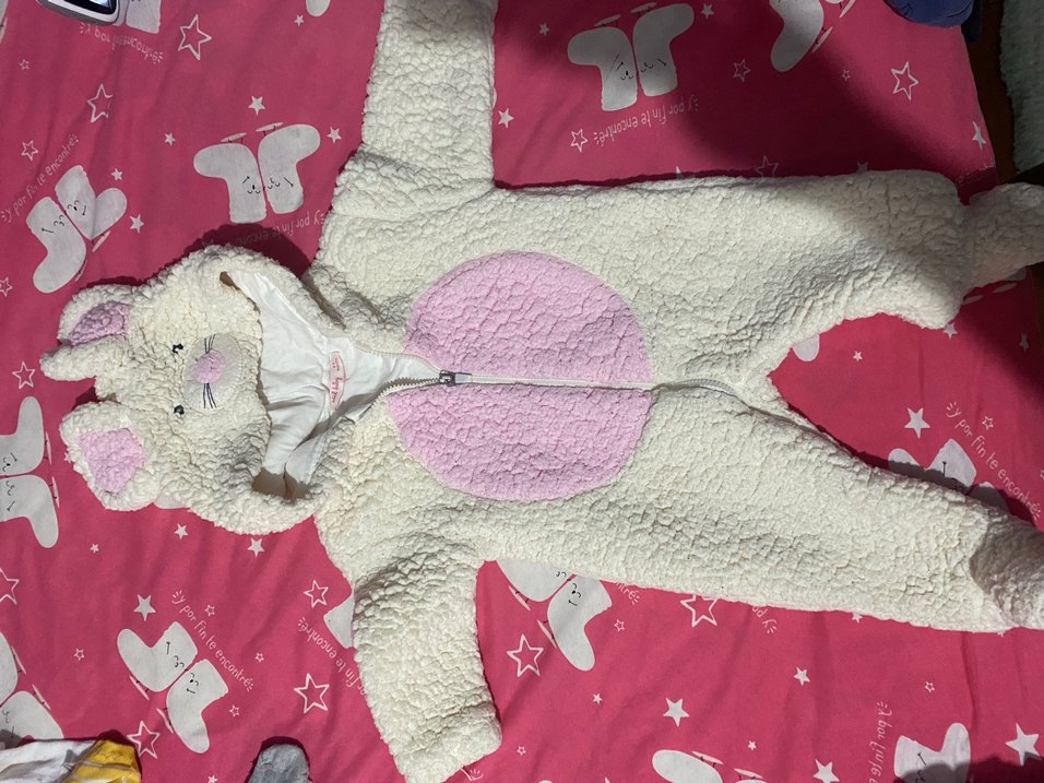 Peluş dokulu, kapüşonlu ve nakış detaylı pastel pembe bebek tulumu, sıcak ve rahat tutar. 0-3 ay
