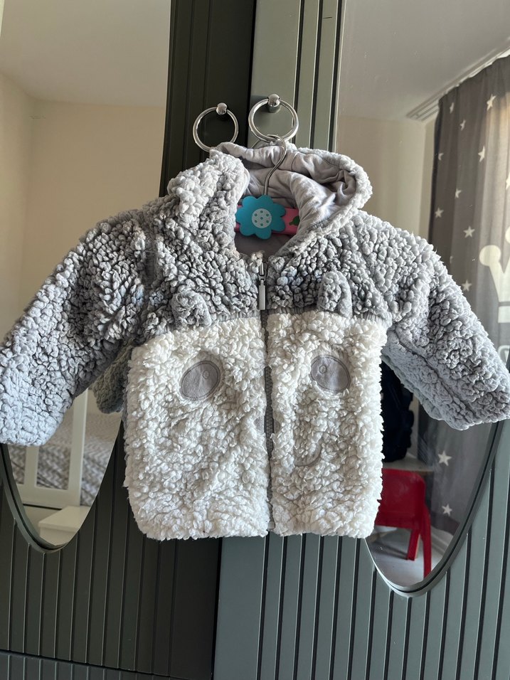 Gri renkli, kapüşonlu ve bol kesimli erkek çocuk kabanı. Nakış detaylı ve yumuşak, sıcak tutan peluş kumaştan üretilmiştir.