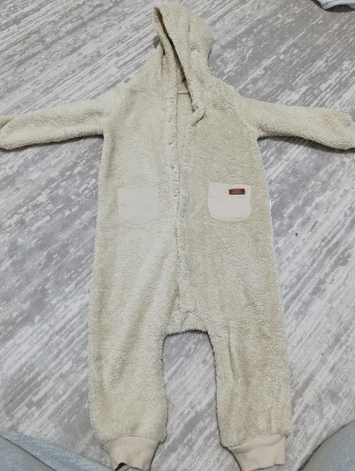 Kapüşonlu, peluş kumaşlı gri bebek tulumu, kürk detaylı. Ön cepleri ve rahat ribanalı manşetleri vardır.