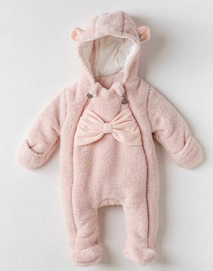 Peluş kumaştan yapılmış, kapüşonlu ve kürk detaylı pembe bebek tulumu, önünde büyük bir fiyonk bulunur. Pastel tonlarıyla yumuşak bir görünüm sunar. 3-6 ay beden welsoft kalındır