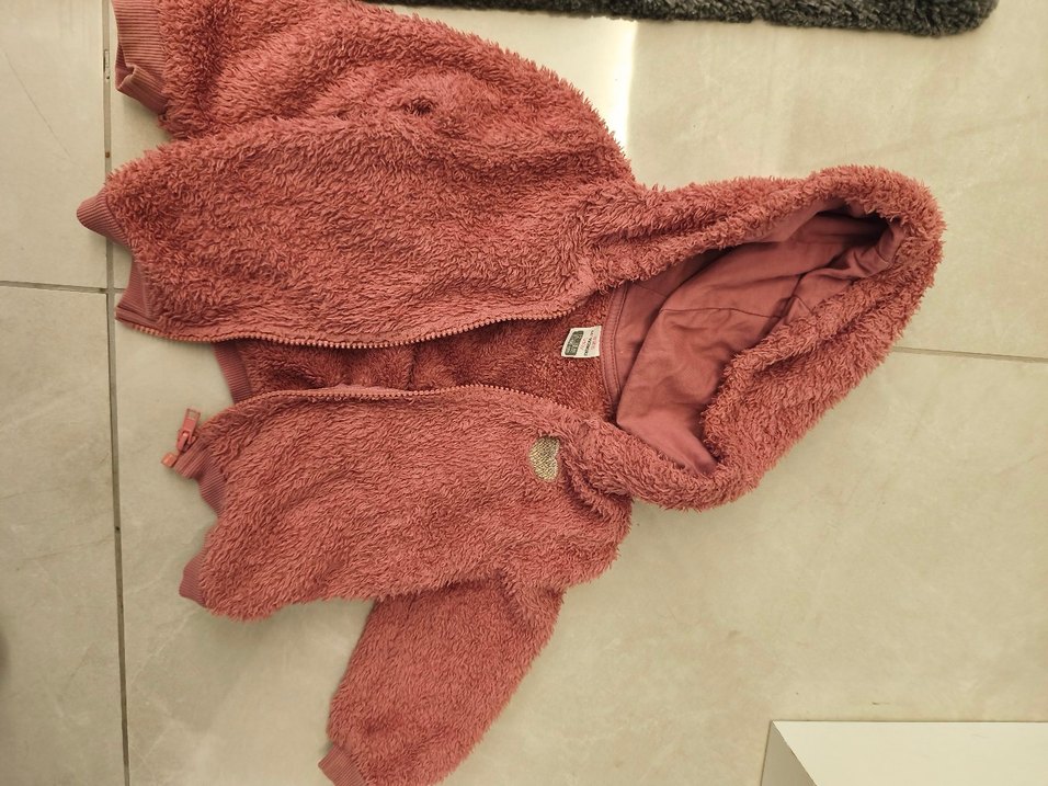 Pastel pembe renkli, peluş dokulu, kürk detaylı ve kapüşonlu kız bebek tulumu.