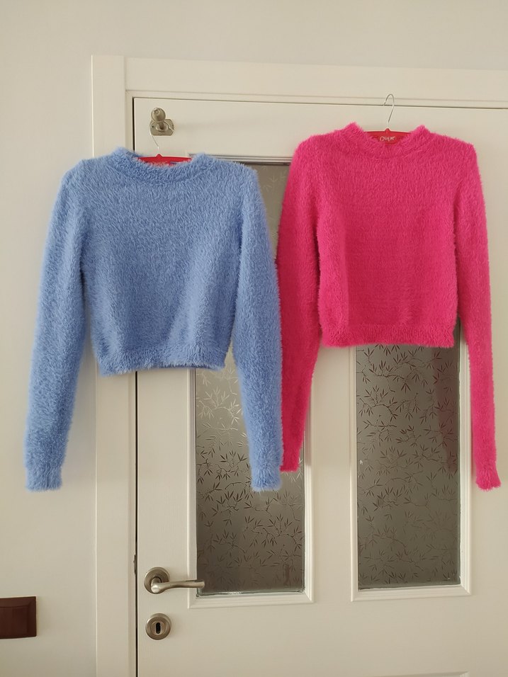 Peluş, iki tane Fuşya ve Bebe Mavisi kazak , uzun kollu, bisiklet yaka ve kısa kesim kadın peluş kazaklar.Yumuşak örgü dokusu günlük kullanıma uygun sade ve rahat bir tarz sunar. İki adet fiyatı.