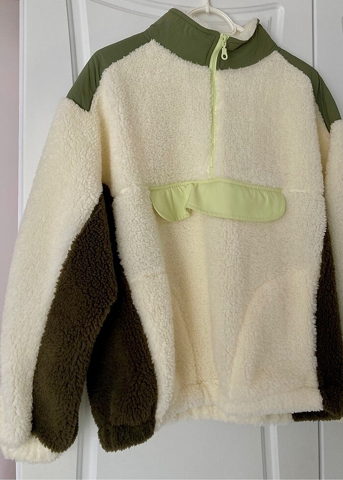 Sıfır üründür, etiketi mevcut. Yumuşacık bir yapısı var iç kısmı yakmayan cinsten. Kol uçları lastikli, kollarının altı farklı renk. Önde iki cebi var. Fermuarlı yakaya sahip. M beden ama oldukça salaş bir duruşu var S, M, L bedene de oldukça güzel duruyor