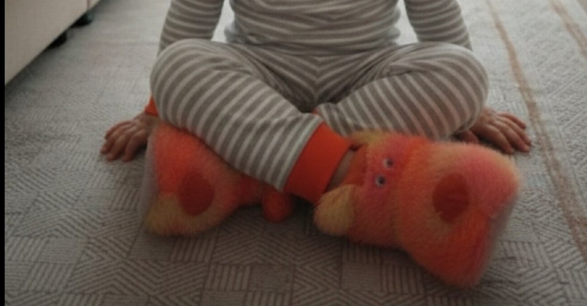 Canlı turuncu ve pembe tonlarında, köpek figürlü, yumuşacık peluş ev terliği/panduf. Altı kaymaz tabanlıdır ve ayakları sıcacık tutar. Tabanlarında sökülmeler mevcuttur