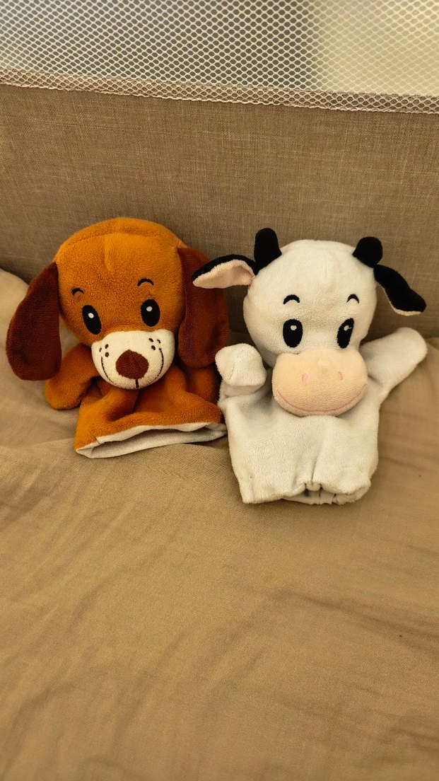 Yumuşak dokulu, kahverengi köpek ve beyaz inek peluş kukla, oyuncak. Ellerinizi içine geçirerek oynatabiliyorsunuz. Bu kuklaları konuşturarak oynattığınızda bebeklerinizin İletişim becerilerinin hızla geliştiğini ve sizinle daha çabuk bağ kurarak öğrendiğini göreceksiniz.