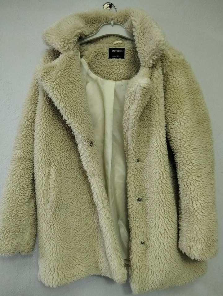 Peluş kumaştan yapılmış, kürk detaylı bej kaban. Notch yakalı, uzun kollu, bol kesim ve midi boyda, rahat ve trend sokak stili için uygun.