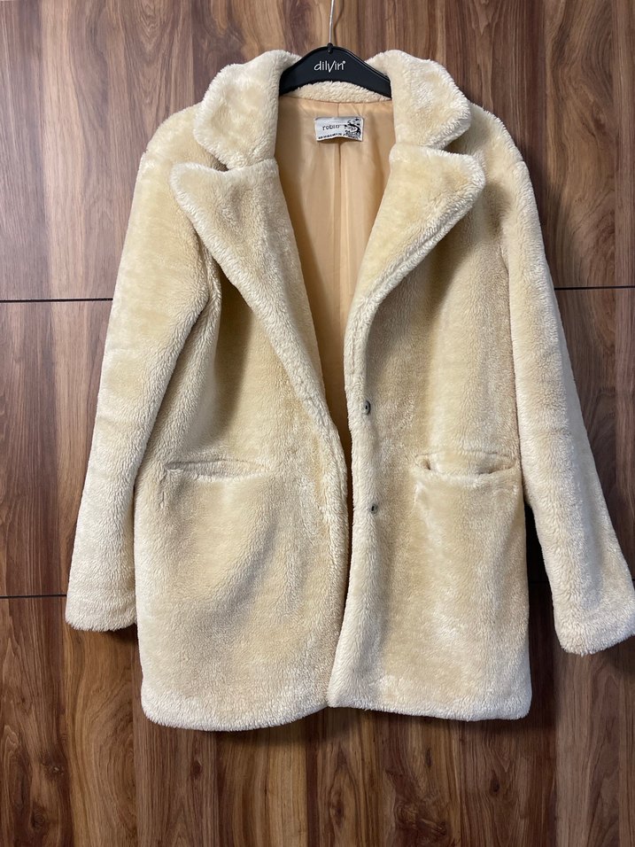 Bej-sarı renkte, uzun kollu kadın kaban. Sağ kolunun iç astarında omuz hizasında yırtık var ve çıtçıt düğmelerinden biri yok.