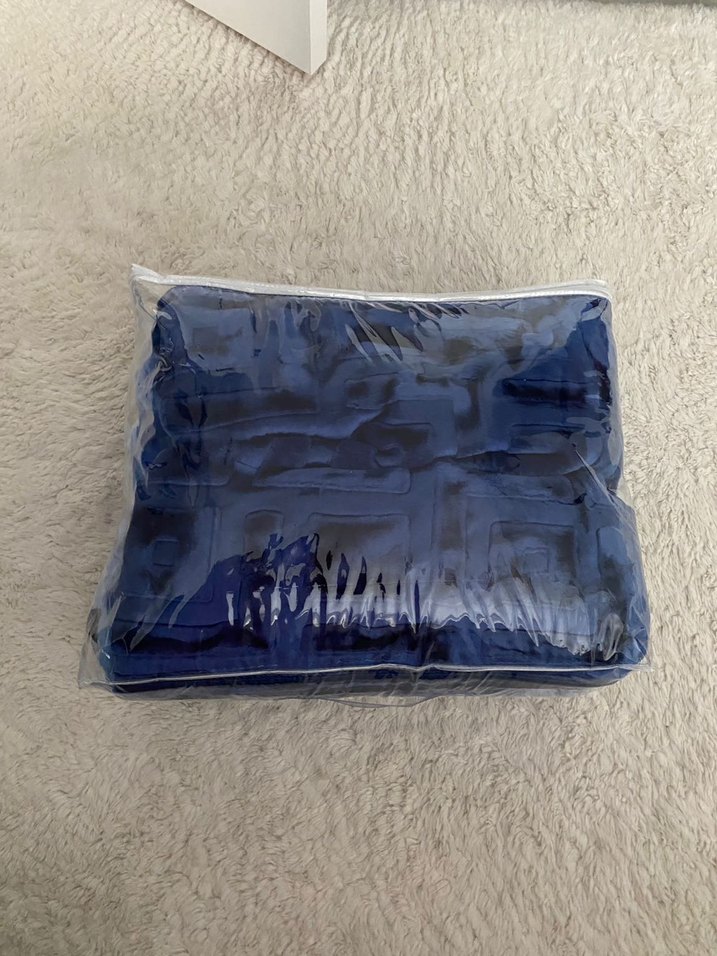Düz yüzeye sahip koyu mavi battaniye, şeffaf plastik poşette temiz ve korunaklıdır. Hiç kullanılmamış ve 3.5kgdır. Detayları son fotoğrafta mevcuttur