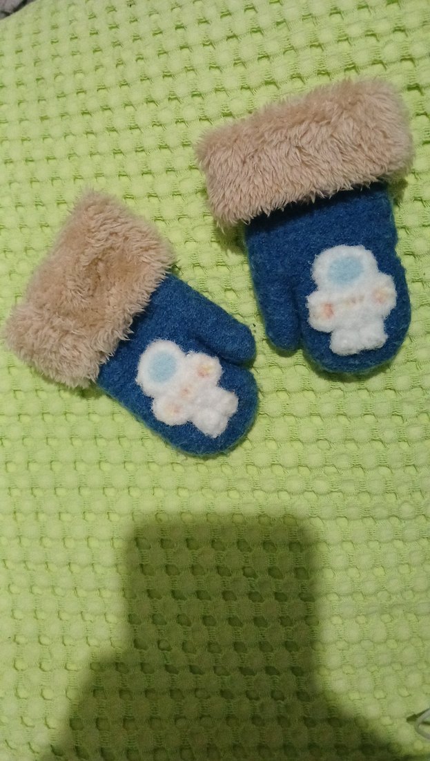 Kız çocukları için mavi örgü eldivenler, yumuşak ve sıcak kumaş, bej sahte kürk manşetler ve nakışlı astronot desenleri içerir.