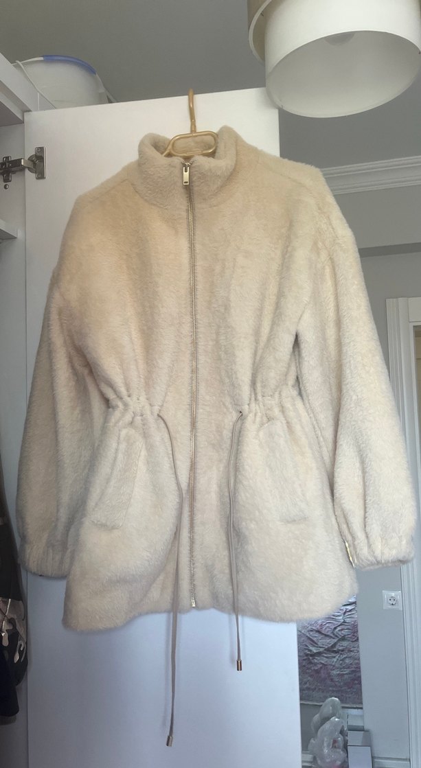 Bej renk, yüksek yakalı ve uzun kollu kadın peluş ceket. Yumuşak ve sıcak kumaştan, belden ayarlanabilir bağcık detaylıdır. Rahat ve günlük kullanıma uygundur.