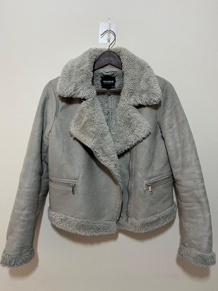 Gri süet kumaştan, kürk detaylı, yakası kesik uzun kollu, günlük kullanıma uygun, rahat ve şık kadın ceketi.
