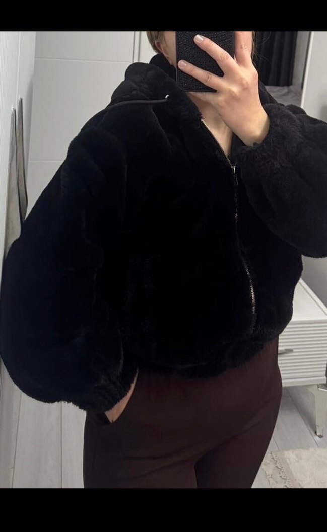 Siyah renkli, rahat kesim, yüksek yakalı ve uzun kollu, yumuşak ve sıcak kumaştan, kürk detaylı peluş kadın ceket.