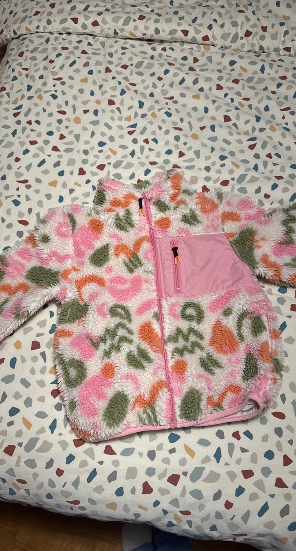 Kız cocukları için kapüşonlu, uzun kollu ve rahat kesime sahip pembe baskılı ceket. Yumuşak, sıcak kumaştan üretilmiş, önde ve göğüste fermuarlı cepler bulunur.
