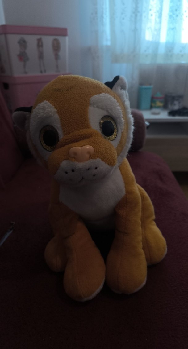 Yumuşak kumaştan yapılmış, büyük gözlü kahverengi ve gri peluş aslan oyuncak.