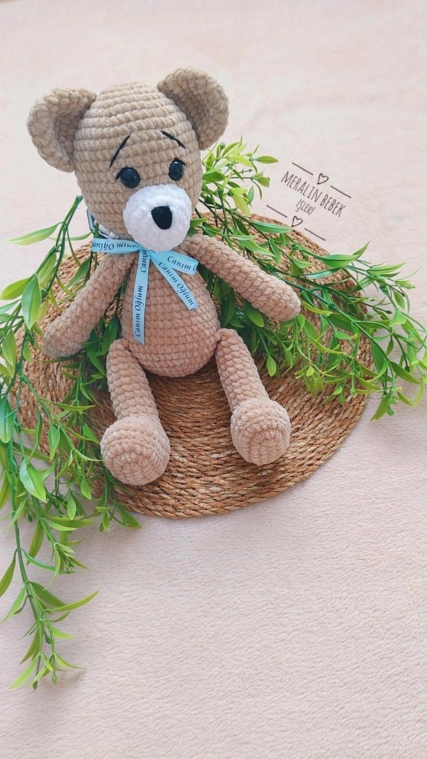 Yumuşak dokulu, pastel kahverengi peluş ayıcık, boynunda mavi kurdeleyle. Her yaşa uygun rahatlatıcı oyuncak. İstenilen renk de örülür...