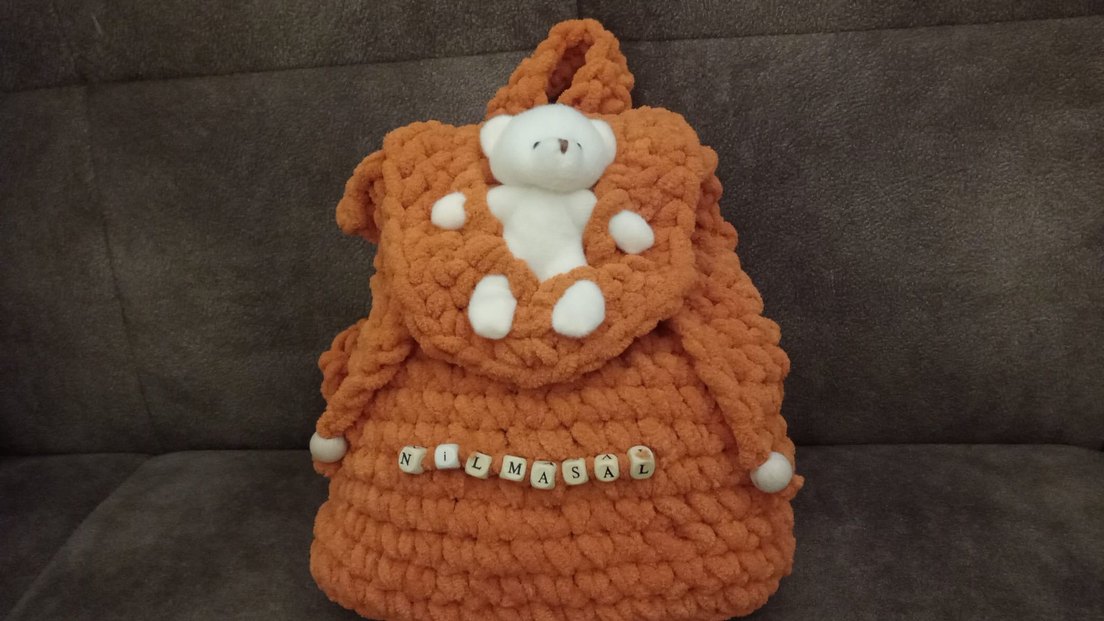 Peluş Oyuncaklı İsimli El Örgüsü Sırt Çanta