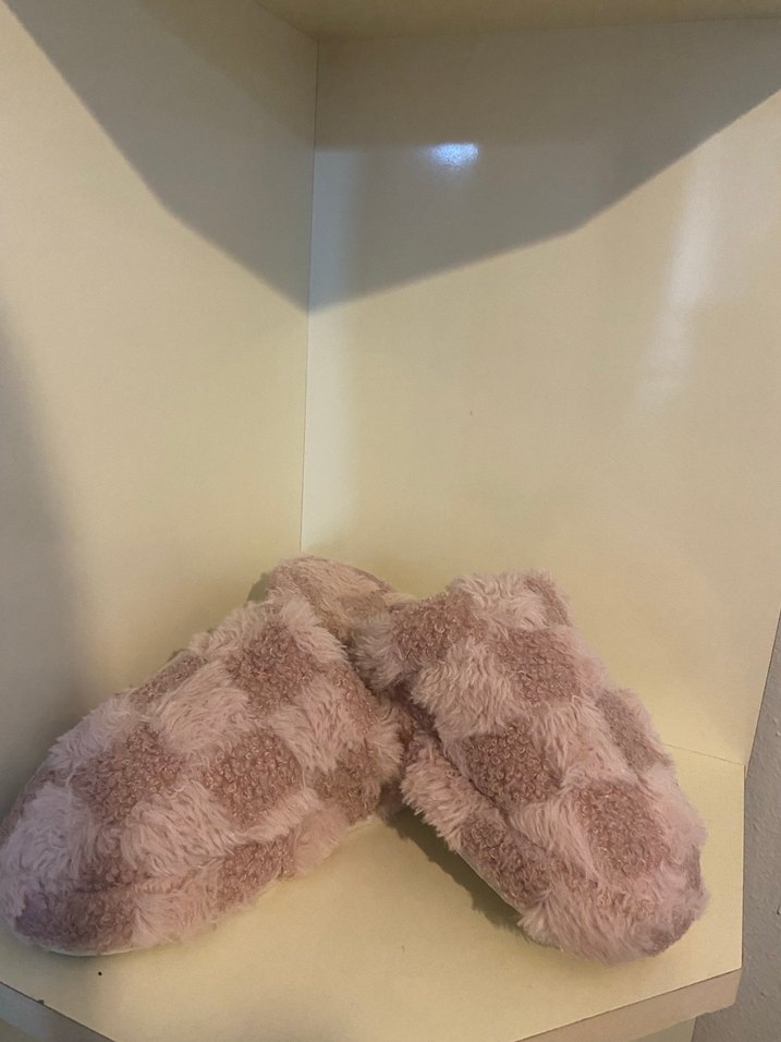 Pembe renkli kadın terlikleri, peluş detaylı ve kareli desenli, yumuşak ve sıcak kumaştan, dolgu topukludur. Günlük kullanım için uygundur.