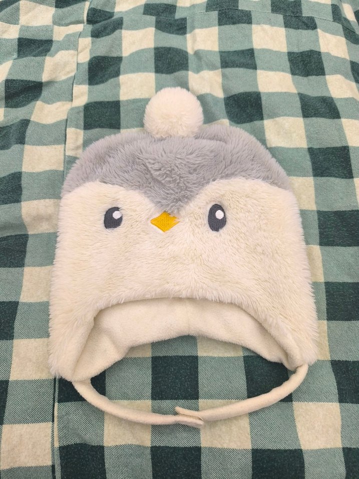 Gri ve beyaz renklerde, peluş detaylı penguen figürlü, kulaklıklı ve ponponlu çocuk bere