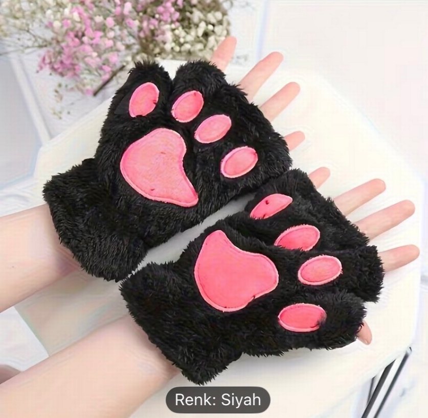 Peluş Siyah Pembe Patili Kadın Eldiven