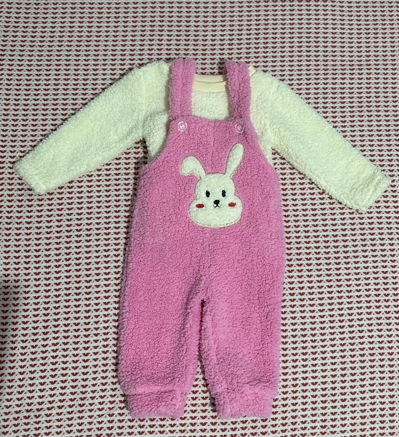 Yumuşak peluş kumaştan yapılmış, önünde tavşan nakışlı pembe bebek tulumu, bebeğinizi sıcak tutar. 12-18 ay