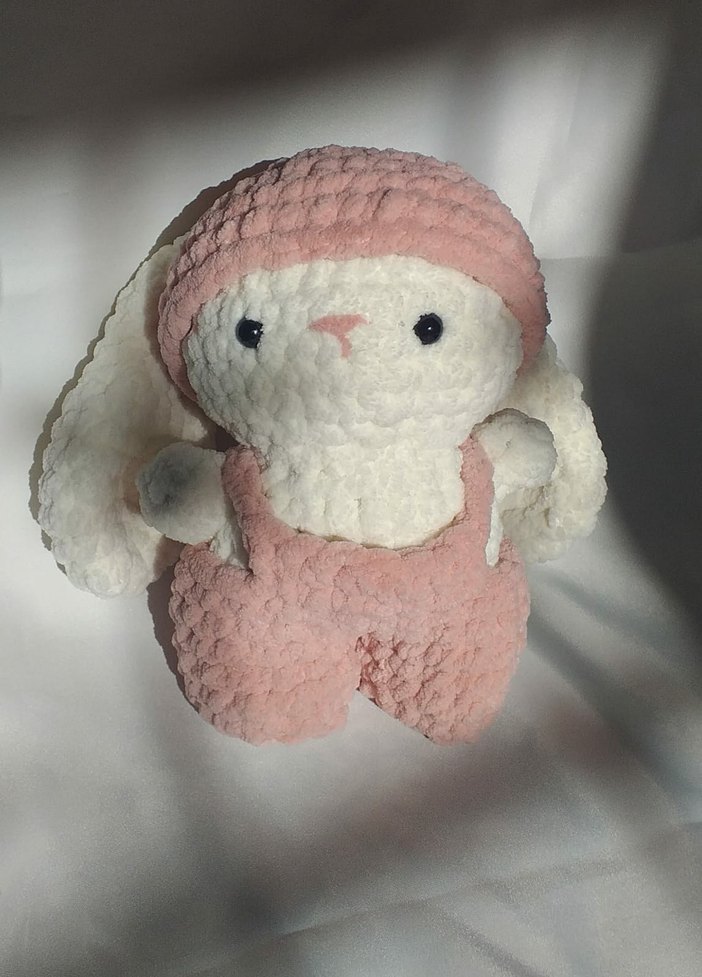 Yumuşak dokulu, pembe pastel ve beyaz renklerde şapkalı peluş tavşan oyuncak.
