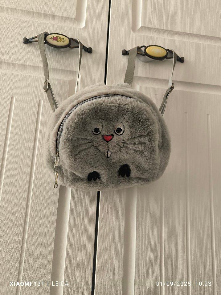 Ayarlanabilir kayışlı, sevimli yüz tasarımlı yumuşak gri peluş
