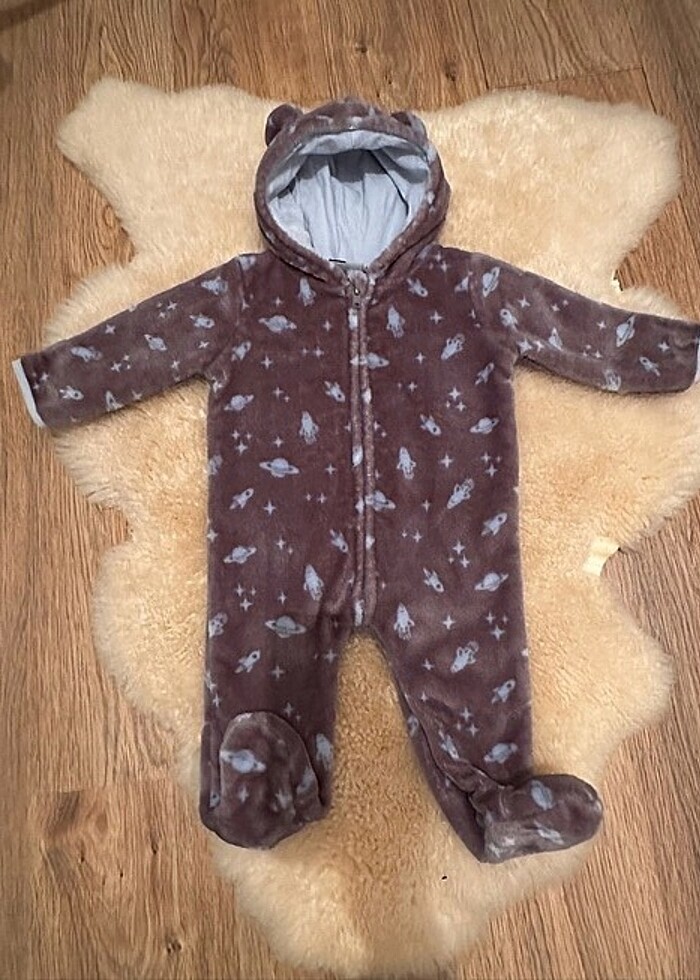 6-9 ay etiketli Penelope mack markalı yeni gibi çok temiz. Amerika’dan alınmıştır. Çok az kullanıldı. Peluşu yumuşacık ve çok kaliteli. Kendinden eldivenli ve patikli. Kapüşon iç astarı pamuklu kumaştır. Vizona dönük bir gri tonu üzerine mavi Uzay desenleri var. Rengi çok güzel.